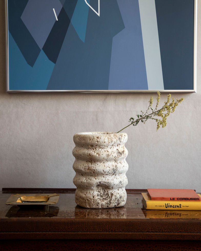 Dimensions: Ø 19 × H 26 cmWeight: 2.25 kgMaterial: Pome stoneThe stone features natural tones and veining inherent to the material. These variations are part of the stone’s nature and are what make each piece one of a kind